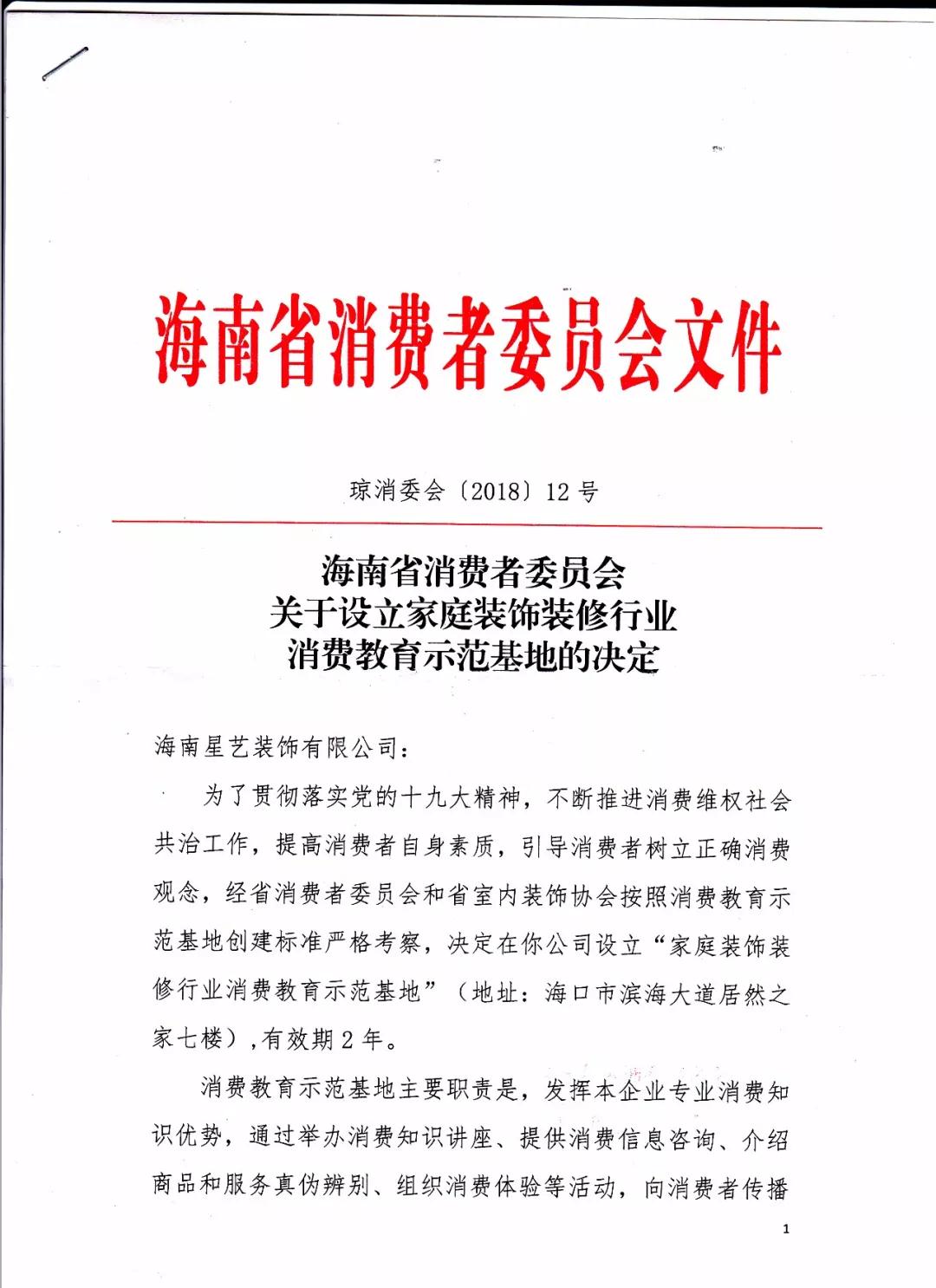 為了貫徹落實黨的十九大精神,不斷推進消費維權社會共治工作,提高消費者自身素質,引導消費者樹立正確消費觀念,經省消費者委員會和室內裝飾協會按照消費教育示范基地創建標準嚴格考察,決定在海南星藝裝飾有限公司設立“家庭裝飾裝修行業消費教育示范基地”